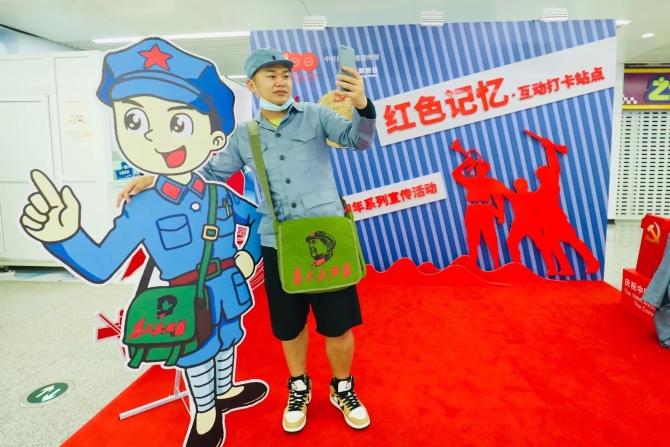 在东风广场站,红色记忆·互动打卡站点的装置以红军元素为主,卡通红军人形立牌、红军水壶、冲锋号、红军竹编草帽……老物件与卡通装置的组合分外吸引眼球,让人瞬间穿越到当年红军长征的峥嵘岁月,感悟不怕远征难的红军精神。