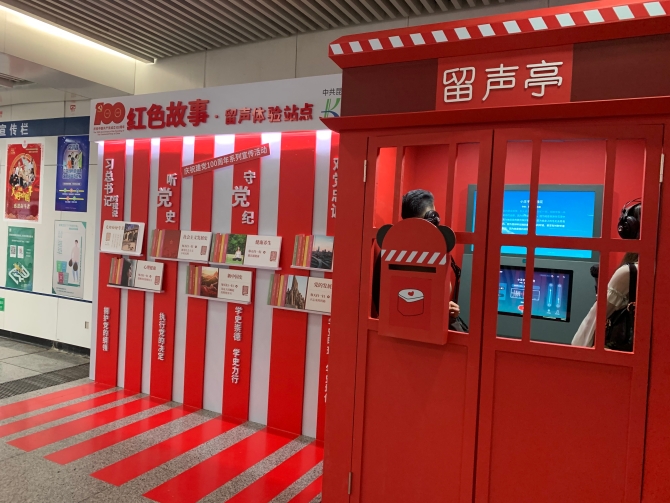 此外,白云路站还一间红色故事留声亭,体验者可以通过专业的录音设备和摄像头朗读红色读物片段,讲出自己的红色故事,还可以即时分享到朋友圈或下载自己的声音音频。高峰期时在留声亭门外,排起了长龙,大家都等着进入留声亭过过主播的瘾。