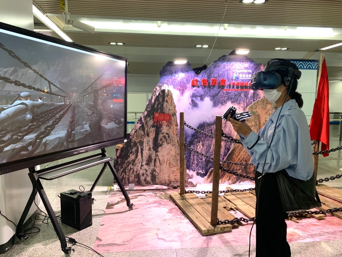环城南路站的红色历史VR体验站点因其好玩的设计,新奇的体验吸引了一大批年轻人的参与。大家纷纷来到现场搭建的模拟泸定桥上体验游戏,互相拍照留念。