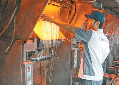 中国巨石集团埃及玻璃纤维工业公司生产车间内,埃及工人正在作业。