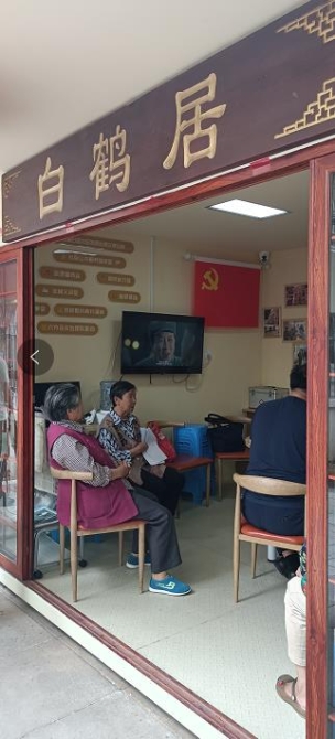 通过“街道党工委一社区党组织一小区(网格)党支部一楼栋党小组一党员中心户”网格化管理和服务五级治理工作模式,201号院得到了有效管理。原本堆满垃圾的角落变成了休息运动的绿色公园,坑洼泥泞的道路变成了整洁的水泥路面,房屋老旧的红砖墙面画上了颇具年代感的宣传画,通过与其他单位的协商共议小院里不单有了专门的停车区域,还设立了公共晾衣区和供居民休息学习的“白鹤居”。