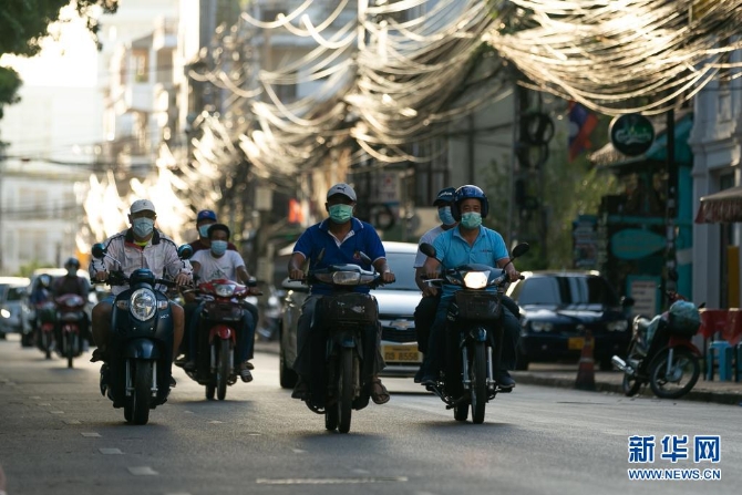 6月19日,市民佩戴口罩在老挝首都万象城区骑行。老挝政府19日宣布,鉴于邻国和首都万象新冠疫情形势,万象实施的“封城”措施再延长15天至7月4日。