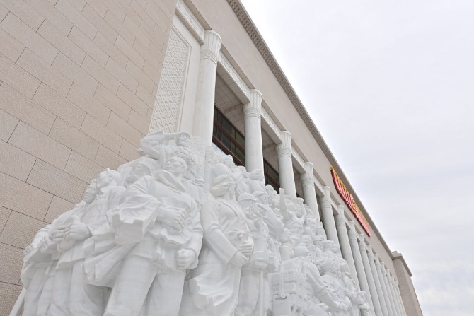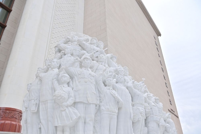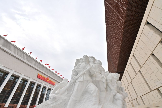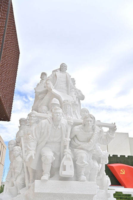 中国共产党历史展览馆西侧广场上,名为《旗帜》《信仰》《伟业》《攻坚》《追梦》的五组雕塑庄严矗立,气势恢宏。