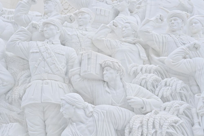 细节一:生动还原攻坚历程。作品共刻画67位人物,包括誓死保家卫国的战士、艄公、南极科考队员等。67位人物构成12个场景激情讴歌中国共产党人艰苦卓绝、攻坚克难的英雄气概和勇于牺牲、甘于奉献的伟大精神。
