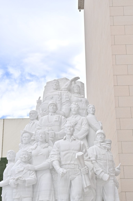 细节一:人物场景揭示新时代成就。雕塑前端正面人物形象是党员干部、大国工匠、农民、军人代表、知识分子、企业家和宇航员等。整个雕塑共塑造人物65位,涵盖不同群体、不同职业,大学生村官、援外维和、建设绿水青山等凸显新时代成就。