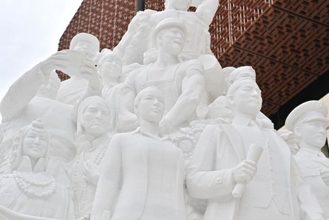 细节一:73位人物形象团结一致。雕塑以“团块结构”作为主体造型语言,73位人物形象融入主体之中,形成团结一致、阔步前行的恢宏阵势,塑造了农民、工人、新经济工作者、党政干部、知识分子和军人形象,各民族的人物形象将生活场景、民族风情进行了诗意化的表现。