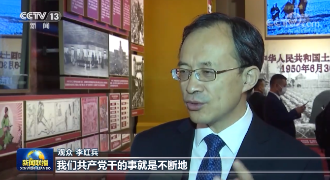观众 李红兵:我们共产党干的事就是不断地把老百姓他们想实现的事,他们家门口的揪心事困难事我们真正把它解决。我们每一个群体都要在这个展览里真正领略这个历史发展的规律,以及找到它的思想方法,这是我们未来来胸怀千年伟业,继续创造辉煌的基础。