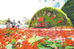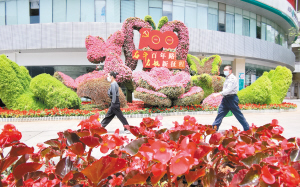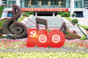 北京路上以庆祝中国共产党成立100周年为主题的鲜花造景。