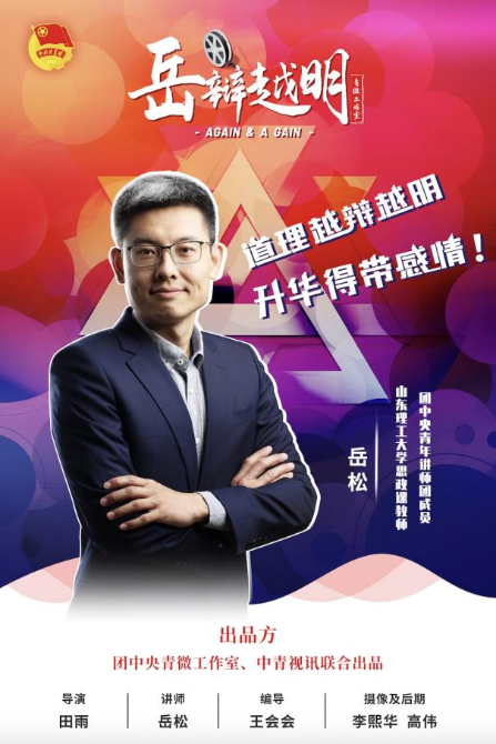 2019年,团中央发起了“青年讲师团”,凝聚了一大批正能量、有思想、能演讲的青年人才,其中就有山东理工大学马克思主义学院教师岳松。“我们以岳松老师为试点,推出《岳辩越明》栏目,结合时事热点、舆论焦点展开评论,以轻松幽默的语言分析评论社会热点话题和事件,引申阐释党的创新理论和政策主张。青年人有很多喜闻乐见的‘网络梗’,这些‘梗’的背后,其实是有很多的逻辑和道理的,‘梗’可以组成段子,我们就是用段子讲故事,用故事引申出想讲的道理。这种表达形式更新颖,更灵活,更接地气。”田雨说。
