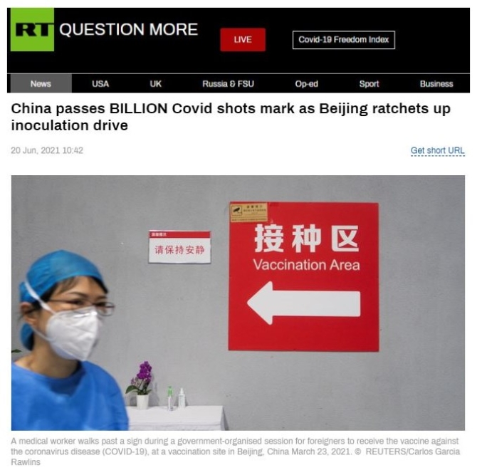 今日俄罗斯电视台网站6月20日的报道说,中国已进行了超过 10 亿剂次的新冠疫苗接种,距离实现既定目标越来越近。