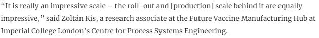 报道援引英国伦敦帝国理工学院一位疫苗研制专家的话说:“这样的规模让人印象深刻——而其背后的推进和(生产)规模同样让人印象深刻。”