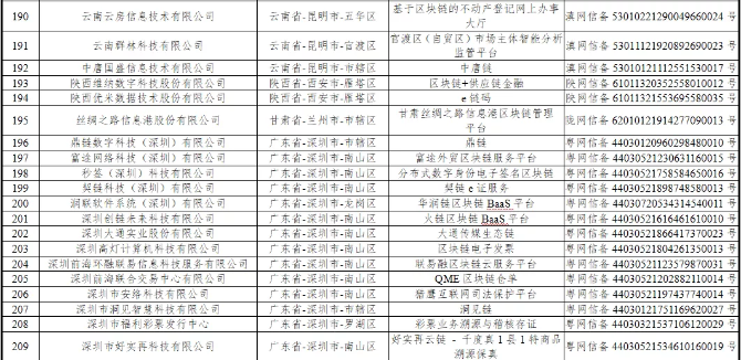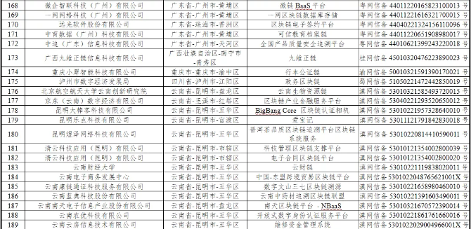 在本批次公布的223个境内区块链信息服务名称及备案编号中,云南群林科技有限公司、云南云房信息技术有限公司、云南蓝典科技股份有限公司、云南康链通证科技服务有限公司、清云科技应用(昆明)有限公司、京东(云南)数字经济有限公司、北京航空航天大学云南创新研究院、昆明大棒客科技有限公司、昆明乐点科技有限公司、昆明煜泽网络科技有限公司、云南财经大学、云南电子商务发展中心、云南南天电子信息产业股份有限公司、云南农优科技有限公司、中唐国盛信息技术有限公司15家云南企业和院校的17个项目备案成功。
