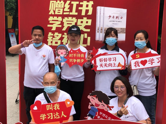 到场嘉宾向书中云南早期共产党人后代、老党员代表、青少年代表等赠送了一批云南党史研究最新成果——由昆明市文史研究馆编写的《少年战士——云南早期共产党人播火记》(以下简称《少年战士》)一书。编著者介绍了该书编撰出版情况,讲述了该书背后可歌可泣的动人故事。现场还开展了庆祝中国共产党成立100周年、党史学习教育宣传海报展示,“学习强国”平台党史互动答题挑战,参观云南解放纪念馆重温红色历史等活动。