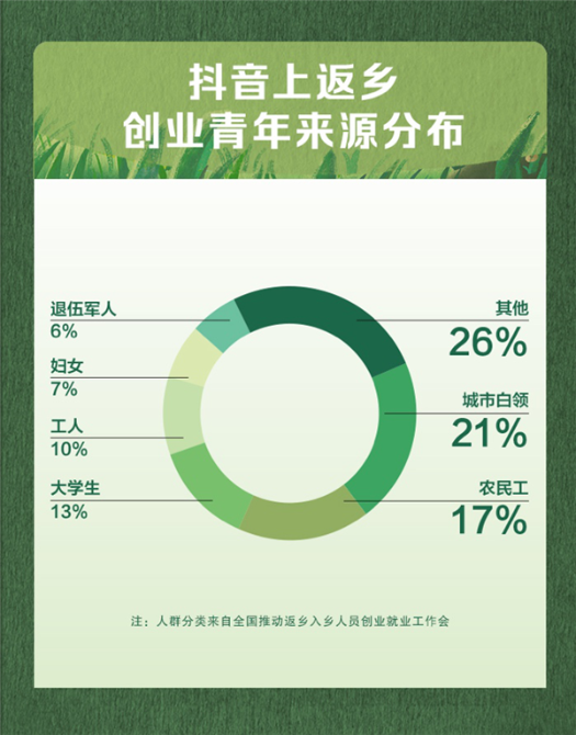 昆明信息港讯 记者劳学丽 6月22日,抖音发布首份三农数据报告(以下简称“报告”)。过去一年,抖音农村视频总获赞量129亿,农村视频创作者收入同比增长15倍。抖音三农创作者中,返乡创业青年占比54%,城市白领返乡创业比例最高,其次为农民工。报告还从三农创作者来源最多的省份县域、最受欢迎的三农视频内容等多角度解析目前抖音三农内容生态。