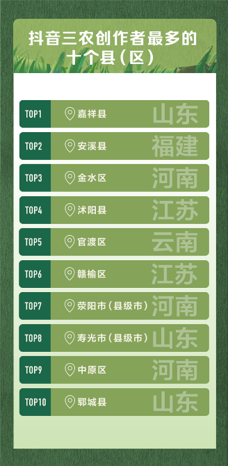 从三农创作者的分布来看,来源最多的省份包括山东、河南、四川这样的农业大省,其次是广东和云南。从县级维度看,山东上榜最多,包括济宁市嘉祥县、菏泽市郓城县和潍坊市寿光县。嘉祥、郓城分别以黄牛养殖和农业器械生产闻名,而寿光作为蔬菜之乡,疫情期间援助武汉备受关注。疫情稳定后,作为全国蔬菜重镇,寿光瓜果借助抖音平台销往全国。