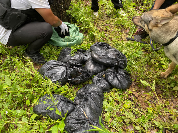 6月20日上午9时,该支队大开河边境检查站民警在工作中获悉,一贩毒团伙准备在边境一带山区进行毒品交易。获此线索后,该站立即组织警力进山搜索。因山高林密,民警搜寻3个多小时未果。下午1时,该站派出警犬“飓风”协助搜寻工作。下午2时15分,“飓风”引导民警在隐蔽的草丛内发现2个被遗弃的绿色编织袋,袋内装有黑色塑料包裹的黑色膏状毒品可疑物13坨。经鉴定,该毒品可疑物为鸦片,重56.35公斤。