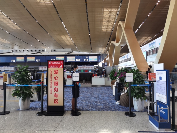 专区首选温馨、舒适、安静的区域,在位置选择上,最大程度考虑值机区域至安检区域最短、最便捷的路线。“爱心服务专区”可为需要爱心服务的旅客提供值机办理、行李托运、轮椅送机、陪同等候等服务,每一个“爱心服务专区”内都设置有“爱心柜台”,工作人员可为无成人陪伴儿童、轮椅旅客、年长旅客等行动不便的人群提供全程陪同和送机服务。在“爱心服务专区”内,还设置有专属休息区,可供旅客及家属休息、陪同使用。