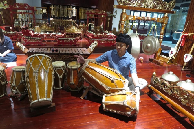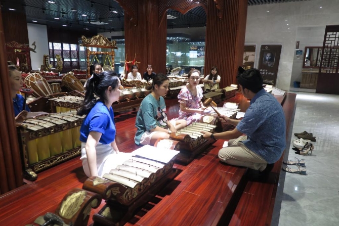 坐落在广西艺术学院的广西民族音乐博物馆乐声阵阵,极具印尼特色的甘美兰乐器吸引了许多音乐爱好者慕名前来学习,印尼籍教师仁迪向学生讲解和展示乐器的演奏方法。