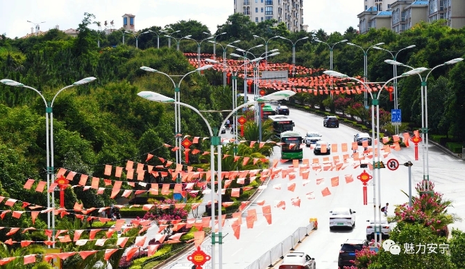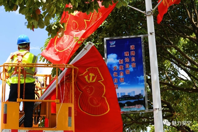 “红起来、飘起来、亮起来、响起来”,如今安宁的主干道及周边重点区域已布置彩旗灯笼5000余米,悬挂建党百年标识红旗1000多面;在主要区域、党政机关、小区、交通路口、公园广场、商场等人员密集区域设置公益广告400余块,栽种鲜花50万盆,6条红色主题公交线路,150块电子显示屏全天候滚动播放宣传视频和海报3万余次,安宁市营造出庆祝中国共产党成立100周年的浓厚氛围。