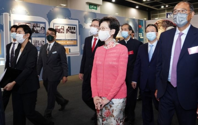 26日,在香港会展中心,香港特区行政长官林郑月娥(中)等嘉宾参观百年中国科学家主题展。新华社记者 王申 摄