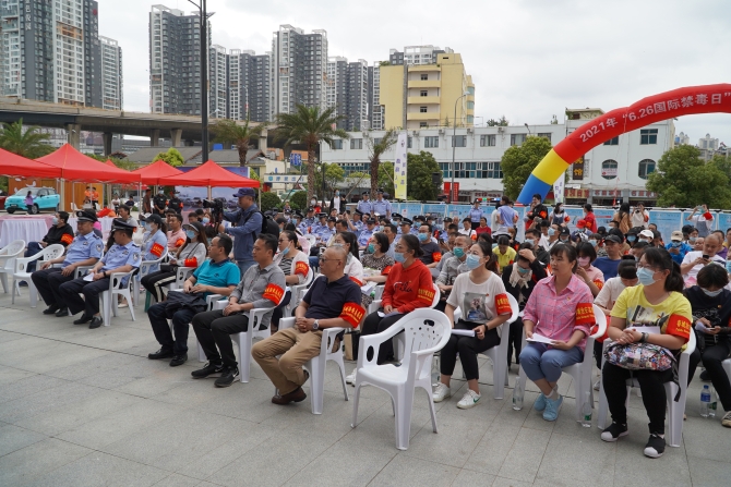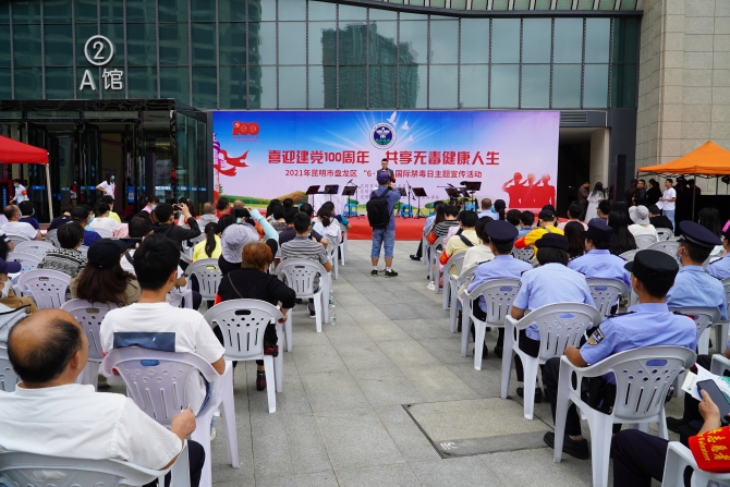 盘龙区禁毒委领导,盘龙区禁毒委各成员单位,盘龙公安分局以及东华街道办事处组织的工作人员、社区禁毒专职人员、志愿者近180人参加了主会场的活动。