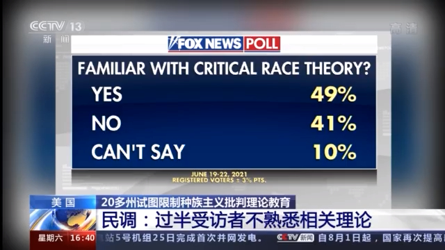 关于美国20多个州试图限制种族主义批判理论教育,美国福克斯新闻网25日报道说,最新民调显示,过半受访者表示对相关的“批判性种族理论”一无所知或不熟悉。