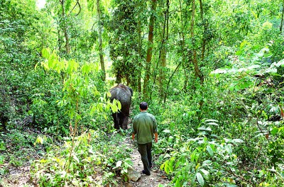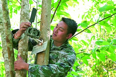 巡护员检查布设在保护区象道旁的红外预警监测相机。