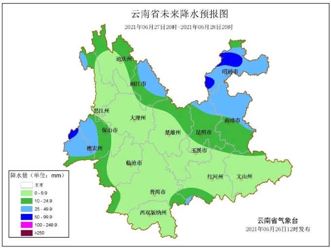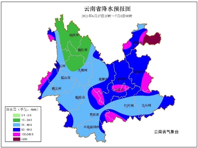 6月27日晚-28日:昭通、曲靖北部、昆明北部、楚雄北部、丽江东部、德宏西部阴有中到大雨局部暴雨、大暴雨,曲靖南部、昆明南部、迪庆东部、丽江西部、怒江北部多云转中雨,其他地区多云有阵雨局部中雨。