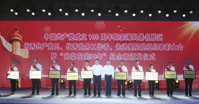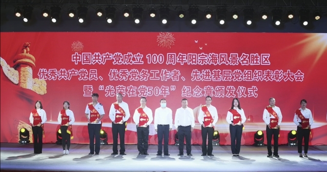 昆明信息港讯 记者龙泉积 6月27日,昆明阳宗海风景名胜区举行庆祝中国共产党成立100周年“两优一先”表彰大会、“光荣在党50年”纪念章颁发仪式。现场,表彰全区各条战线涌现出的优秀共产党员、优秀党务工作者和先进基层党组织,动员各级党组织和广大党员以先进典型为榜样,筑牢政治忠诚,强化示范引领,建功新时代,奋进新征程。