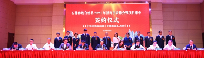 昆明信息港讯 记者龙泉积 6月28日,石林县招商引资推介暨项目集中签约仪式在石林银瑞林国际大酒店举行。现场,石林县人民政府与19家企业负责人签订《投资项目合作协议》,协议总投资达103亿元,实现了石林县“十四五”开局之年投资促进工作“开门红”。