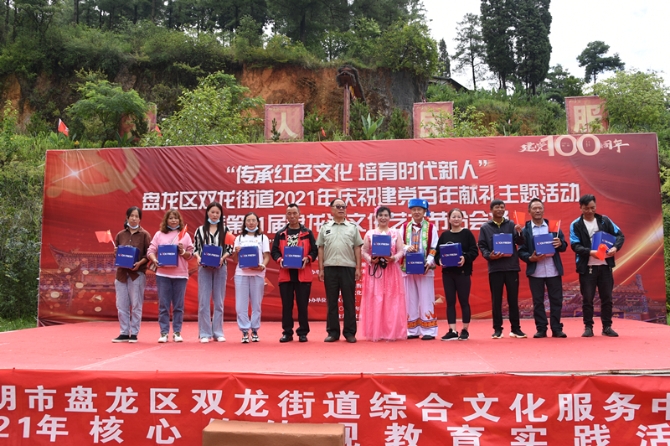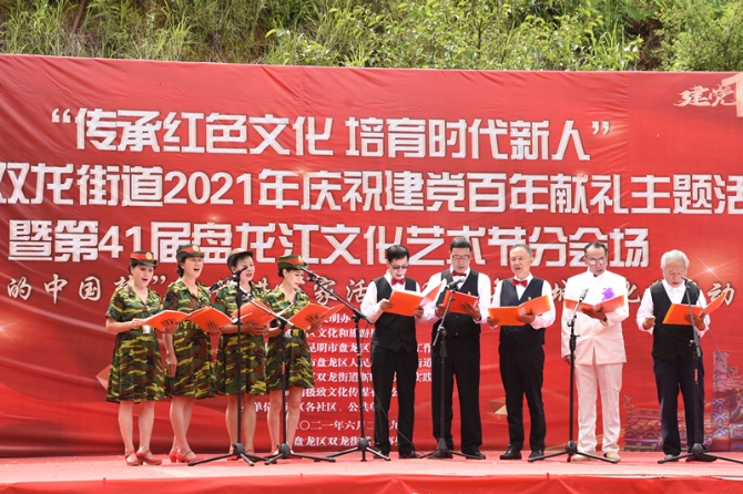 昆明信息港讯 记者李红鸾 通讯员赵志娟 6月29日上午,盘龙区双龙街道2021年“传承红色文化 培育时代新人”庆祝建党百年献礼主题活动暨第41届盘龙江文化艺术节分会场、“我们的中国梦”文化进万家活动、2021春城文化节活动在盘龙区双龙街道乡村旅游协会党支部——锡伯龙红色文化庄园举行。用最美妙的颂歌,在中国共产党百年华诞之际向党献上最真诚、最深情的声音。来自双龙街道的近200名党员、干部和群众参加了此次活动。