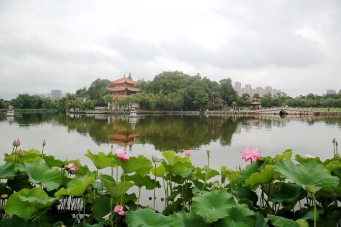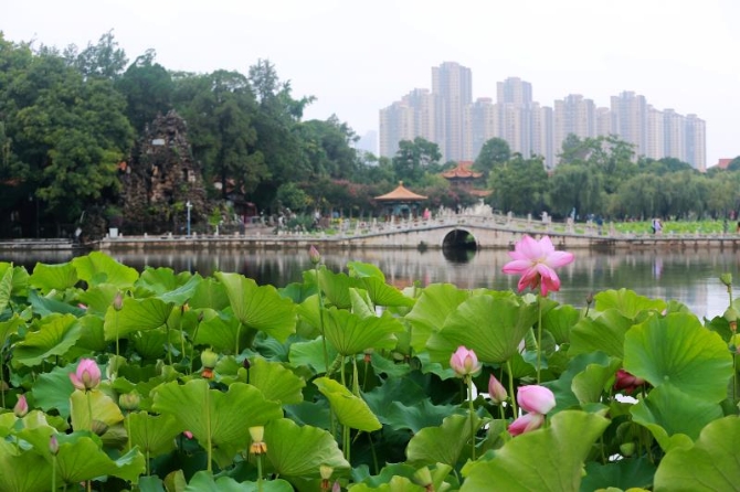 昆明信息港讯 记者杨雁 接天莲叶无穷碧,映日荷花别样红。6月29日,昆明市大观公园第十七届荷花展启幕,今年荷花的花朵显得尤其的大,其中不乏有浓烈松香味的“巨无霸”、曾获得全国荷花新品种一等奖的“足韵”和“足翠”、淡堇紫色的“春不老”等各地引进栽种的优秀荷花品种,大观楼长联中所描绘的“九夏芙蓉”景观令人陶醉。