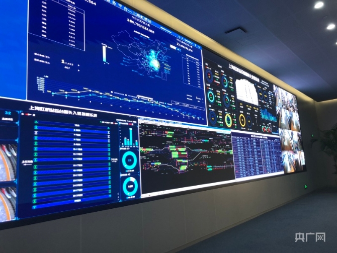 上海虹桥站综控室监测大屏(央广网 记者王晶 摄)