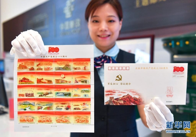 新华社北京6月29日电 记者赵文君 《中国共产党成立100周年》纪念邮票和纪念封29日在北京发布。中国邮政将于7月1日发行《中国共产党成立100周年》纪念邮票1套20枚,纪念封1套1枚。