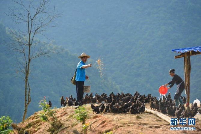 贵州省剑河县南明镇台沙村驻村第一书记杨精泽(左)与村民在合作社里喂鸡(2017年6月7日摄)。新华社记者 杨文斌 摄