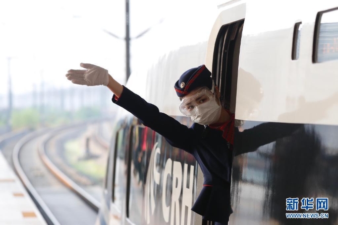 在武汉站,G431次列车乘务员艾婷婷在发车前向乘客挥手(2020年4月8日摄)。这是武汉市正式解除离汉离鄂通道管控措施后开往湖北省外的首趟始发列车。新华社记者 沈伯韩 摄