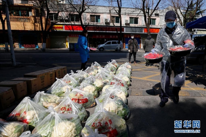 下沉至武汉市花桥社区的干部在搬运居民订购的草莓(2020年2月20日摄)。新华社记者 沈伯韩 摄