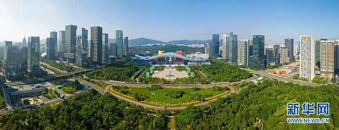 这是2020年10月2日拍摄的深圳市民中心和莲花山公园一线(无人机照片)。新华社记者 梁旭 摄