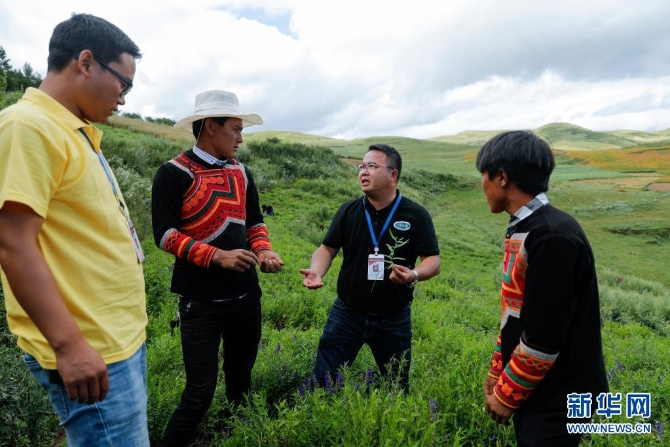 贵州省望谟县乐旺镇党委第一书记张航(右)在农技员岑连刚的指导下给花椒苗修枝(2020年9月15日摄)。新华社记者 陶亮 摄