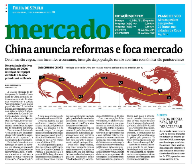 2013年11月13日,《圣保罗页报》头版头条介绍中国全面深化改革的部署。