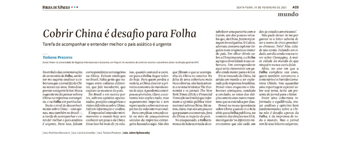 2021年2月19日,《圣保罗页报》在创刊百年当天刊登了资深专栏作家塔蒂亚娜·普拉泽雷斯的署名文章说,2021年是中国共产党建党100周年,期待今年《圣保罗页报》能有更多关于中国的报道,这也是“送给巴西读者的一份特殊礼物”。