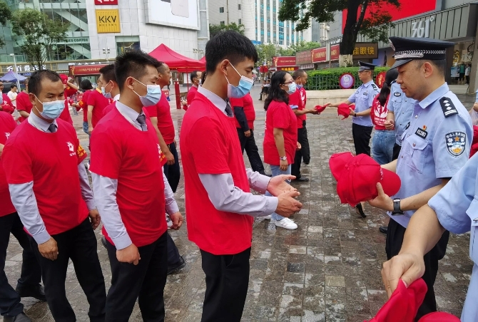 昆明信息港讯 记者合宇聪 29日上午,昆明市公安局五华分局举行治安志愿者服装标识发放仪式,向街道办事处干部、社区党员群众、治安积极分子、流口服务管理队伍及公益岗位人员发放印有“春城治安志愿者”标识的红T恤、小红帽及红袖标,全区范围内累计发放20000余件(套)。