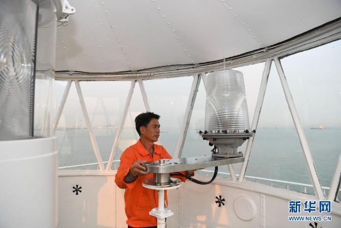 在珠江口伶仃洋北端的舢舨洲,航标工黄灿明在检查灯塔辅灯设备(2019年4月2日摄)。新华社记者 邓华 摄
