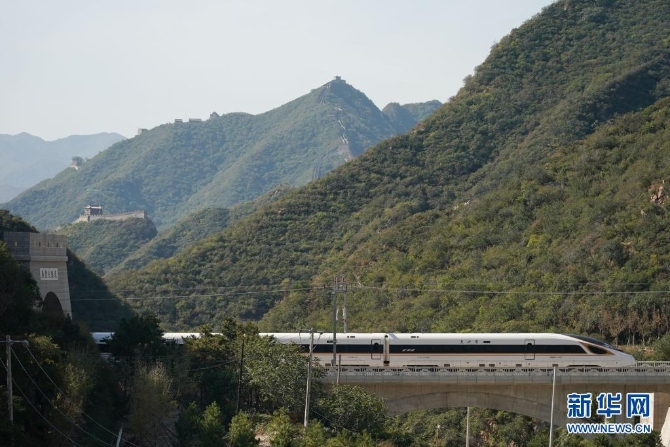 一列复兴号高铁列车从京张高铁驶过居庸关长城(2020年10月6日摄)。新华社记者 鞠焕宗 摄