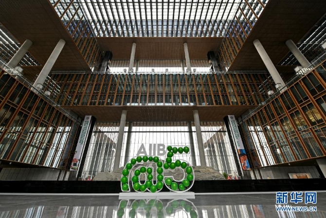 这是亚投行总部大楼内景和庆祝正式开业五周年装饰(2021年1月13日摄)。新华社记者 李鑫 摄
