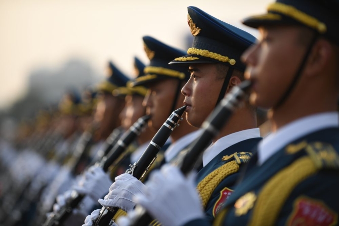 7月1日,庆祝中国共产党成立100周年大会将在北京天安门广场隆重举行。这是清晨,军乐团在练习。