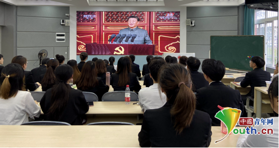 武汉纺织大学外经贸学院师生在观看庆祝中国共产党成立100周年大会直播。武汉纺织大学外经贸学院供图