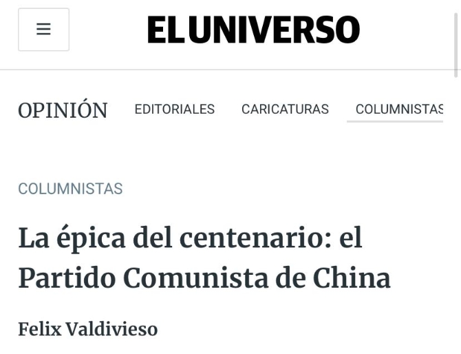 厄瓜多尔《宇宙报》网站近日发表了西班牙IE大学中国中心主任费利克斯·巴尔迪维索的文章《百年史诗:中国共产党》。文章说,在中国,有一首广为流传的歌曲名叫《没有共产党就没有新中国》。“新”意味着与过去的屈辱历史一刀两断。现在我们面对的是一个焕然一新的中国,它已完成了自我重塑。