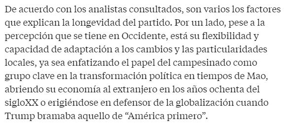文章说,中国共产党之所以能在发展过程中推动意识形态进化以应对每一次的需求和挑战,与其非凡的现实主义、务实、长远眼光和精心规划密不可分。这都是中国共产党在百年道路上成功的关键。
