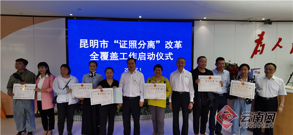 7月1日,昆明市“证照分离”改革全覆盖工作启动仪式在五华区政务服务中心举行,为云南泽源商贸有限公司、昆明市五华区厚合办公用品经营部等首批享受到“证照分离”改革全覆盖红利的市场主体颁发营业执照和许可证。这是昆明市在建党百年之际,在全省率先启动、与全国同步实施“证照分离”改革全覆盖工作,为广大市场主体送上的一份大礼包。